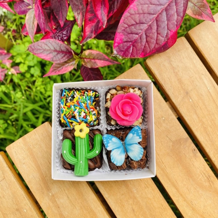 Cada uno está cubierto con un delicado fondant temático de primavera, decorado con detalles como cactus y mariposas que realzan su atractivo. Además, cuentan con una exquisita rosa artística elaborada también en fondant. Los toppings incluyen fudge con grageas de colores, pecanas, trocitos de chocolate y coco, creando una combinación deliciosa y visualmente atractiva.