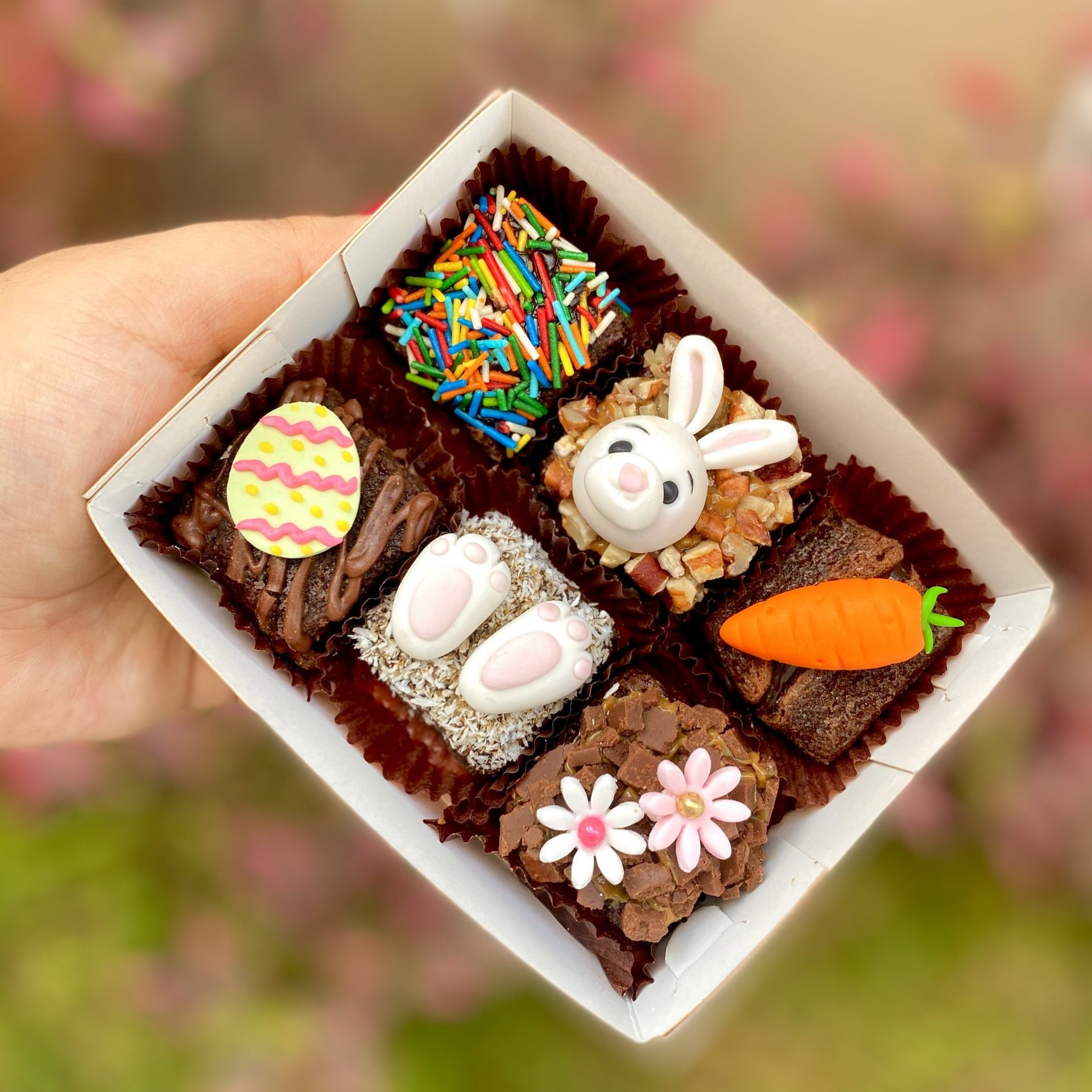 Nuestros brownies están decorados con adornos en fondant, todos elaborados a mano con atención al detalle. Desde un tierno conejito dividido en dos brownies, con su cabecita en uno y sus patitas en otro, hasta brownies adornados con flores y una jugosa zanahoria, cada diseño agrega un toque de encanto y creatividad a tu experiencia dulce.