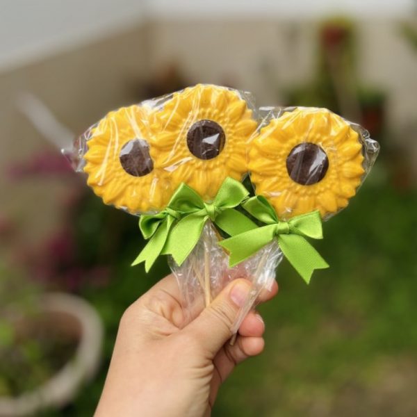 Nuestras paletas de chocolate inspiradas en la primavera combinan exquisito sabor con un toque artístico. Puedes acompañar tus decoraciones con hermosos girasoles que transmiten la calidez y la alegría de la estación. Estas paletas son perfectas para regalar y alegrar cualquier día especial con un detalle único.