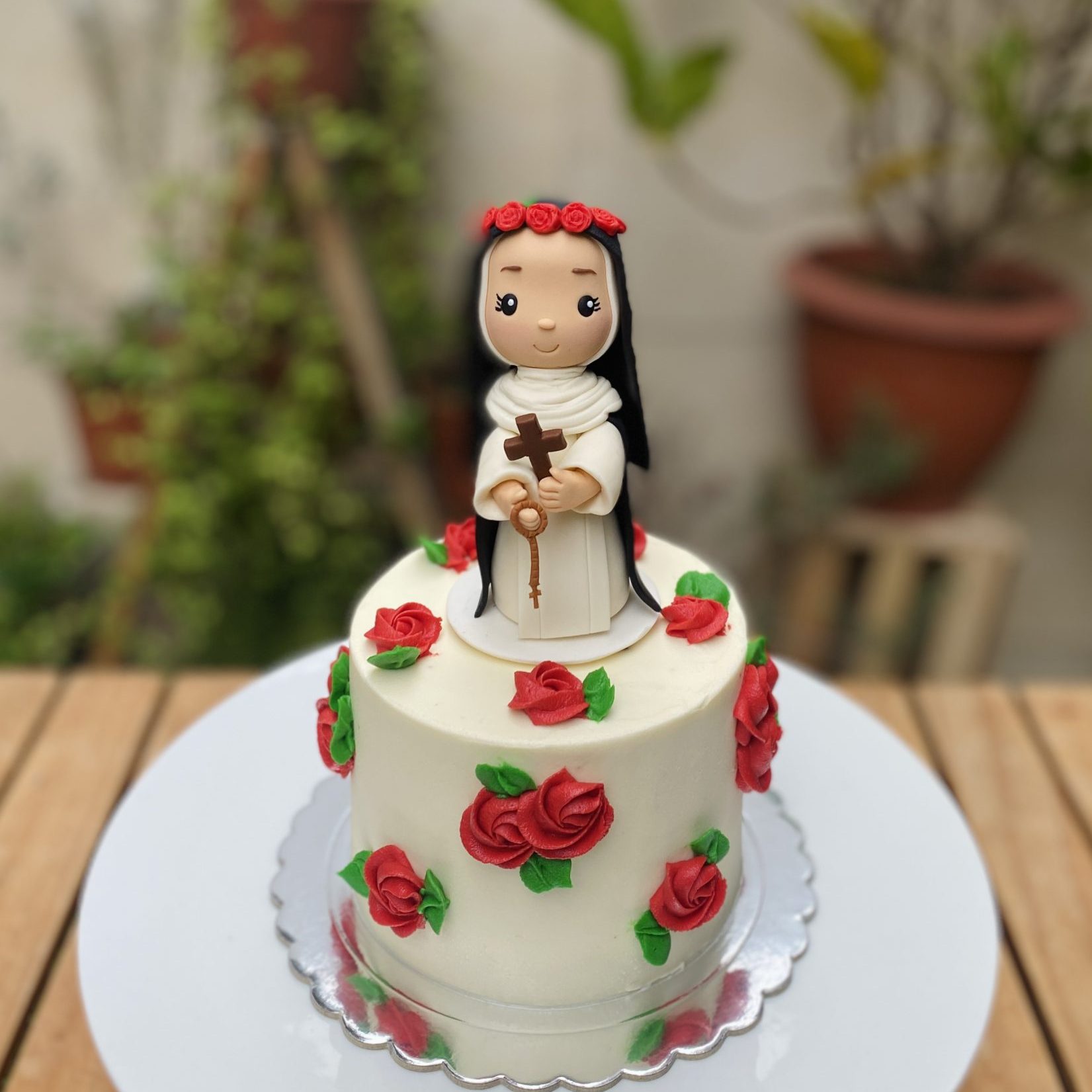 El toque distintivo de nuestra torta es el detalle en 3D de azúcar que representa a Santa Rosita, con su hábito blanco y negro, corona de rosas y llevando en sus manos su cruz y rosario, un símbolo de devoción y protección.