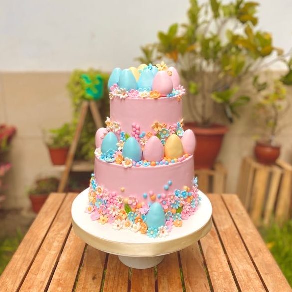 La superficie de la torta está adornada con una multitud de pequeños huevitos de colores pasteles y delicadas florcitas, que iluminan esta temporada festiva con su encanto. Disfruta de esta obra maestra chocolatosa en tu celebración de Pascua y deleita a tus seres queridos con un postre memorable y delicioso.